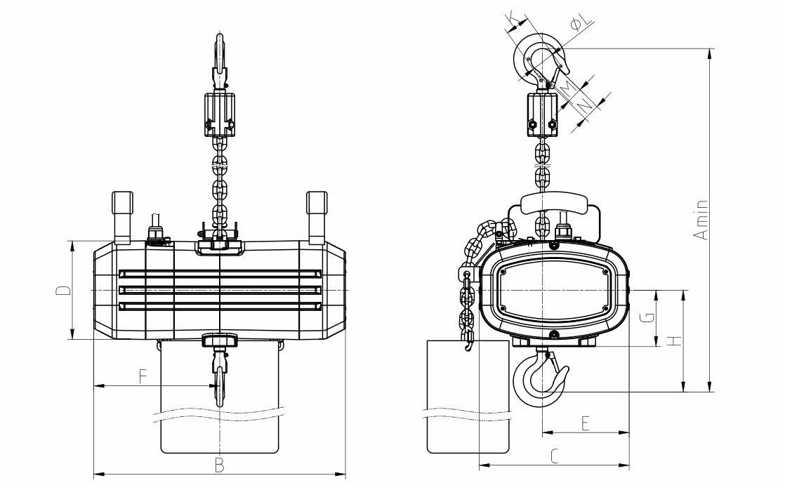 JTDG型舞臺式環鏈電動葫蘆技術參數表及外形尺寸(標準起升高度3m)