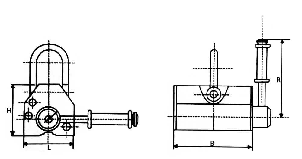| Model | Rated Lifting | Cylindrical Lifting | Max pull-off | L | B | H | R | Operation | Net Weight |
