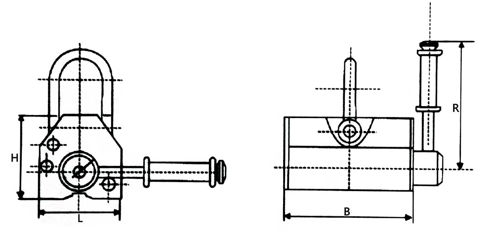 | Model | Rated Lifting | Cylindrical Lifting | Max pull-off | L | B | H | R | Operation | Net Weight |