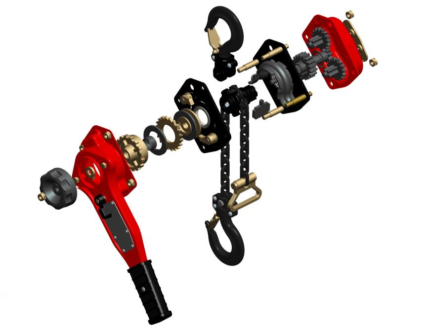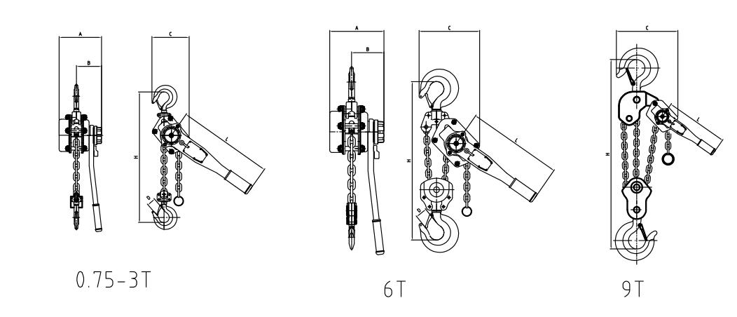 | 型號 | 額定載荷(t) | 起升高度(m) | 試驗載荷(t) | 手板力 kg(n)(ibs) | 起重鏈條 | 尺寸規格(mm) | 重量 | ||||||
