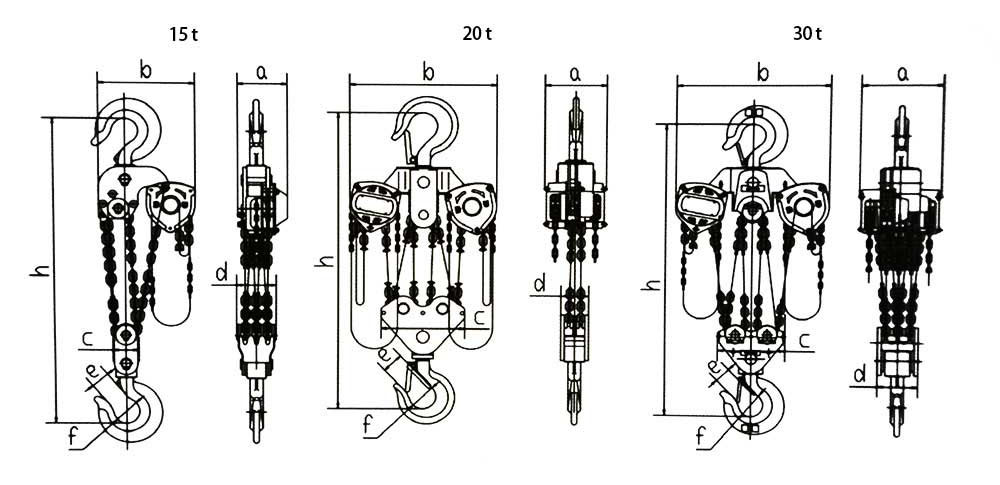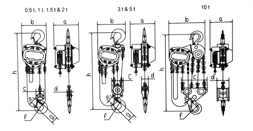| 型號 | 額定載荷(t) | 起升高度(m) | 實驗載荷(N) | 手拉力 (N) | 起重鏈條 | 主要尺寸(mm) | 凈重(kg) | ||||
